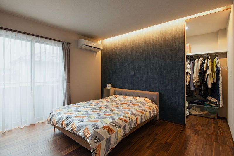 間接照明と落ち着く色合いで、高級感と居心地の良さを兼ね備えた寝室