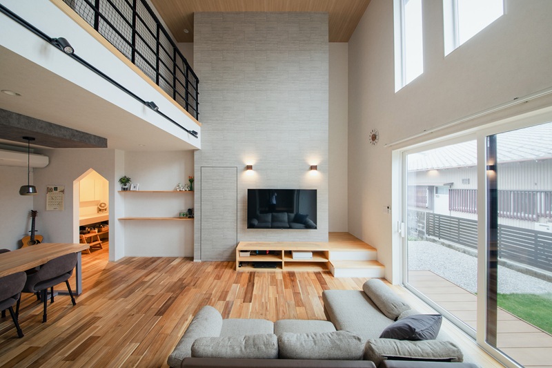ハイ天井の開放的な明るいリビング